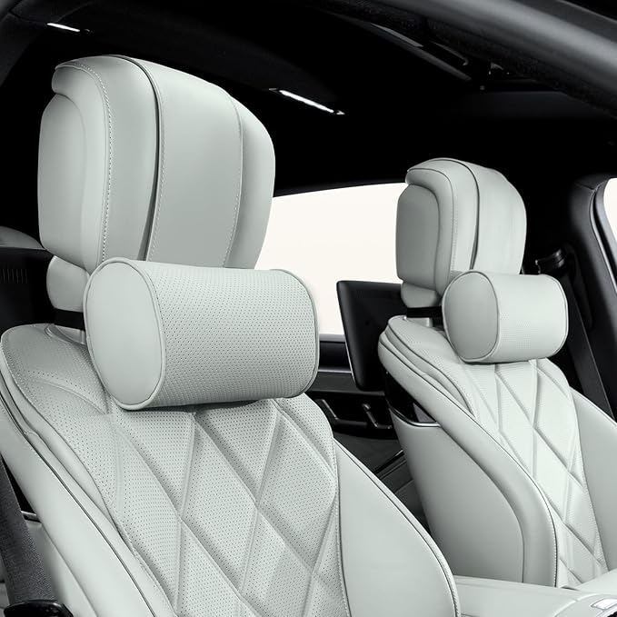 Car Headrest Pillow for Driving - Luxury Leather 100% Memory Foam, Ergonomic Neck Support - Universal Fit Head Rest Travel Pillow for Most Cars, Home & Office, Gray, 2 Pack