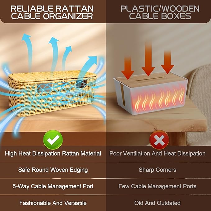 - [Cooling Ventilation System]: Our rattan cord hider box offers built-in breathability with countless small air vents. The clever design—featuring 5 dedicated ventilation slots—ensures your power strips and electronics stay cool even during extended use. No more worrying about overheating: keep your cables neatly hidden and your devices running smoothly with this stylish and functional solution.