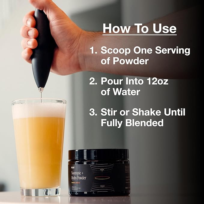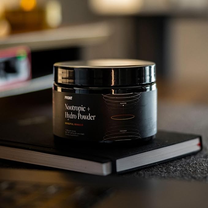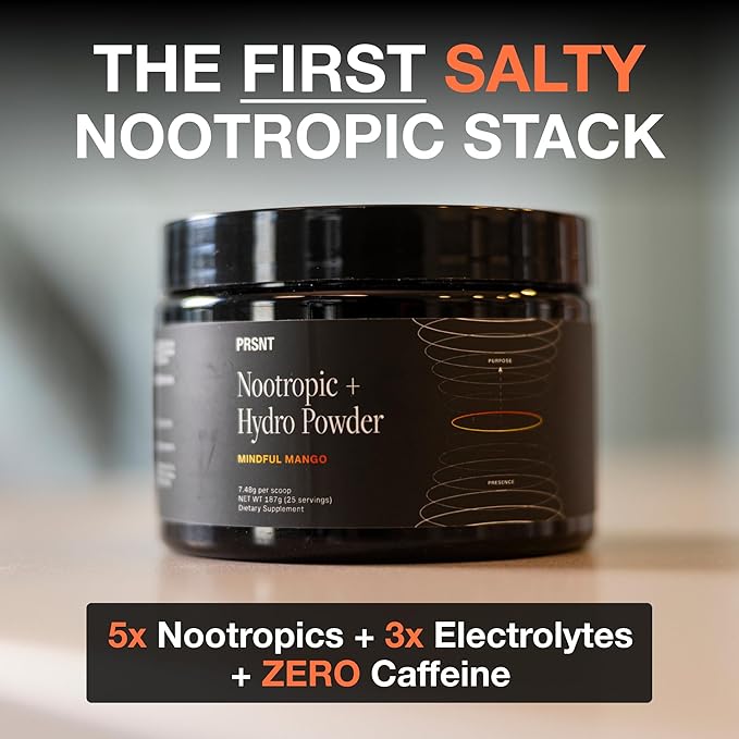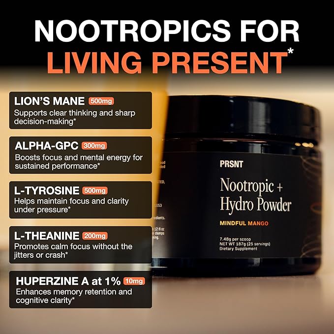 PRSNT Nootropic Drink Powder – Mango Flavor – Focus, Energy & Brain Boost Supplement – Lions Mane, Alpha GPC, L-Tyrosine, Magnesium, Electrolytes – 25 Servings, Caffeine-Free, Sugar-Free
