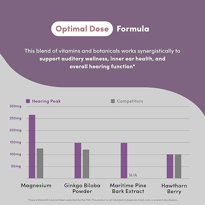 - SUPPORTS EAR HEALTH: Hearing Peak features scientifically studied ingredients - like magnesium, Ginkgo biloba, and acetyl L-carnitine - to support auditory wellness and help maintain inner ear health as part of your daily routine*