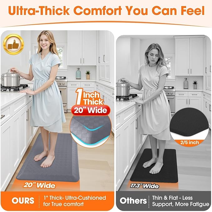 StepRite 1” Thick Kitchen Mats for Floor, Anti Fatigue Kitchen Rugs, Non-Slip,Heavy Duty Waterproof Kitchen Rug, Standing Desk Mat for Home, Kitchen, Office(Grey)