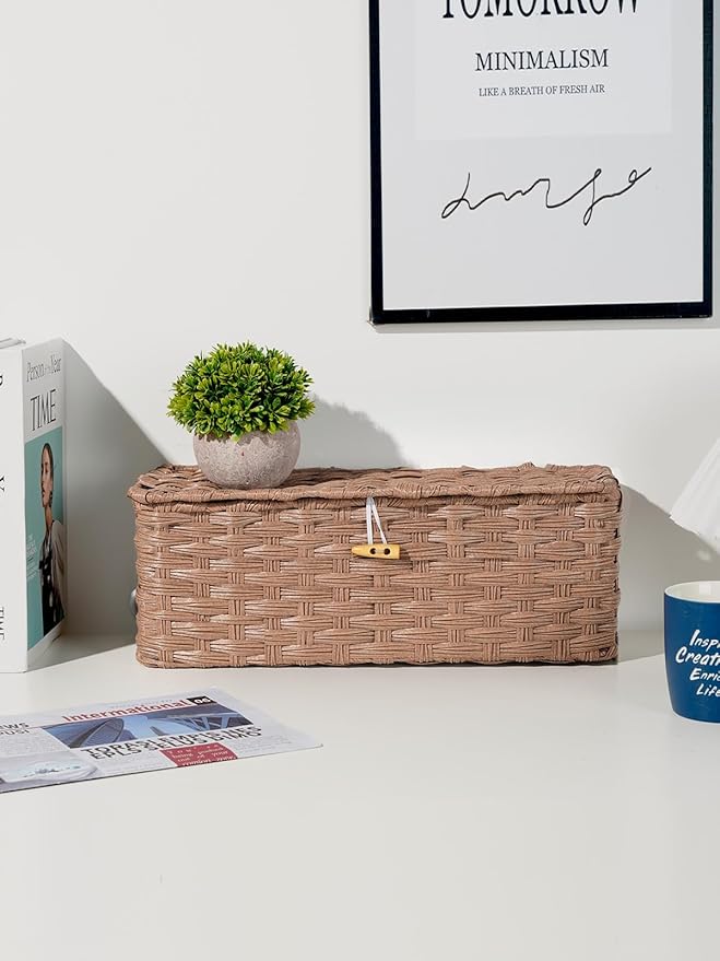 Temary Cable Management Box with Lids, 2-Pack Handmade Cable Organizer Boxes for Home, Office to Hide Cords and Power Strip, Cord Cover Floor Hider Set Woven Rattan Cable Organizer Box (Brown)