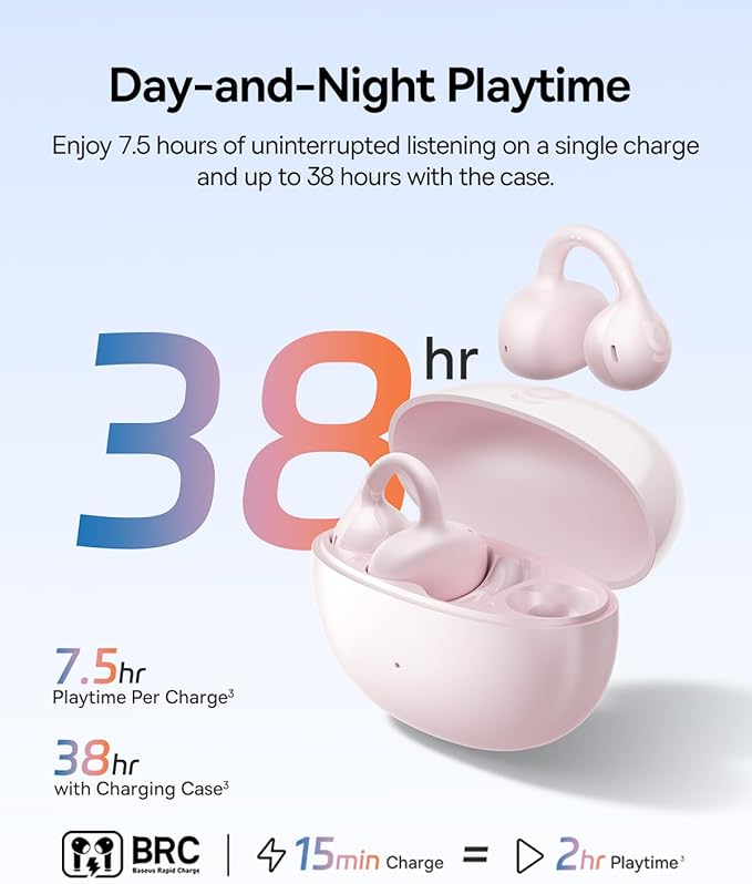 - [Open-Ring Comfort & Style]: Stay aware and stylish with the Baseus Bass BC1 clip on wireless earbuds. The open-ring, non-intrusive design offers breathable, pressure-free comfort without blocking your ear canal—ideal for glasses wearers and earring lovers. Enjoy music and your surroundings at once with these lightweight open-ear earbuds
