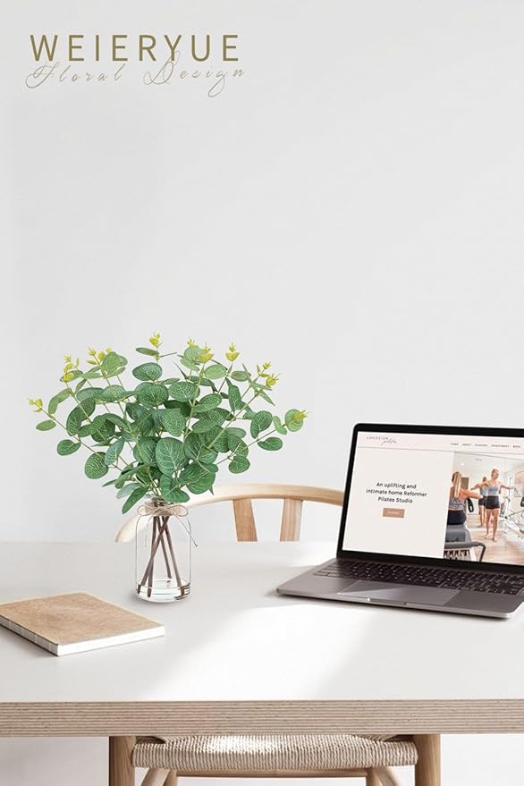 - 【Maintenance-free】The acrylic water ensures that the eucalyptus leaf adheres well to the glass vase, so you don't have to worry about it falling off or spend time arranging them. The artificial green plant stems require no water, sunlight, or fertilizer, will never wilt or shed, stays green year-round.Eucalyptus leaves are easy to clean; simply wipe with a soft dry cloth to keep them neat and tidy.