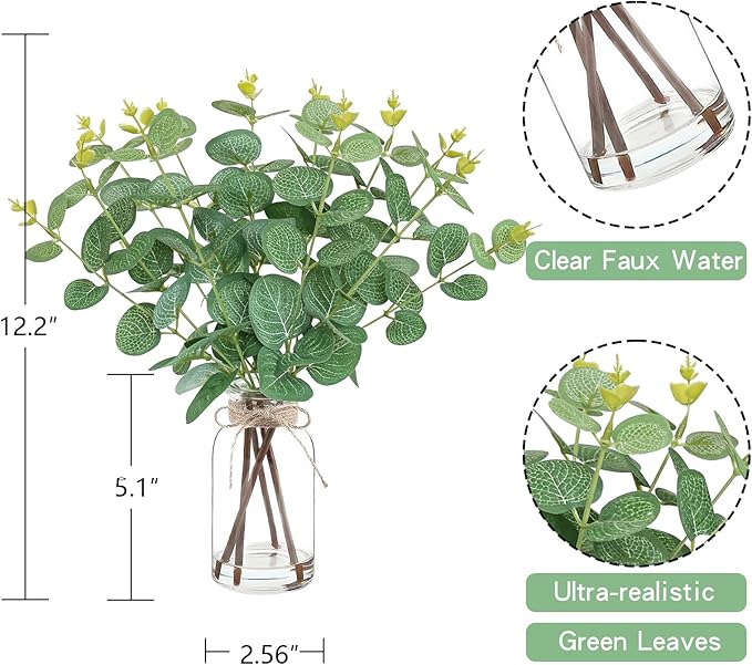 - 【Lifelike Artificial Eucalyptus】: A safe and durable quality material, the eucalyptus leaves of the fake plant are made of environmentally friendly plastic. Bright colors and realistic leaves paired with glass vases with fake water make these fake plants more life-like and look more natural.