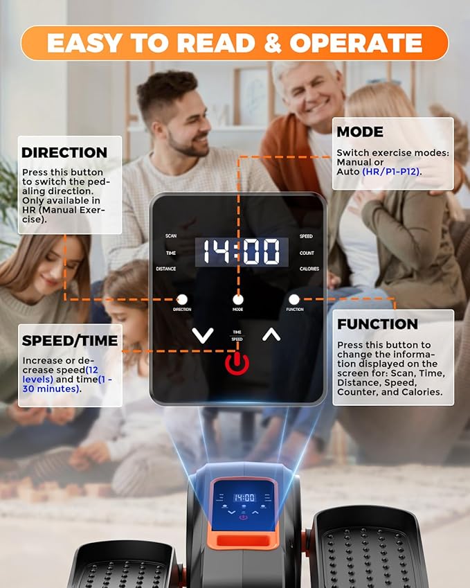 - 【2-in-1 Design】: Our elliptical trainer features both manual (12 speed levels) and automatic modes (P1-P12) to suit your preferences. The foot pedal can be moved forward and backward to target different muscle groups, enabling you to choose the optimal speed for your workout based on your needs, ensuring a personalised exercise experience