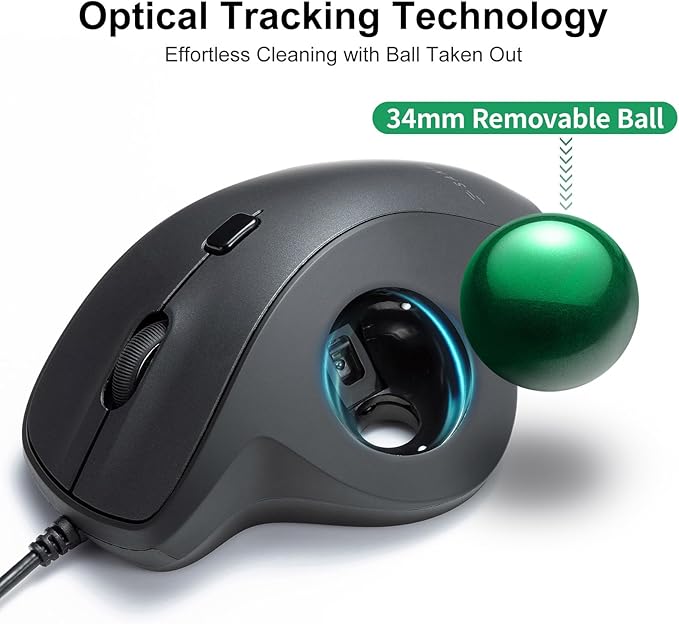 - Ergonomic Thumb Mouse - Places your hand in a natural wrist & arm position for smoother movement, less muscle tension, and relieve fatigue & wrist pain. No driver required. The 34mm green trackball stays in place, controlled by your thumb, making it easy to use on any surface—even your lap or couch.