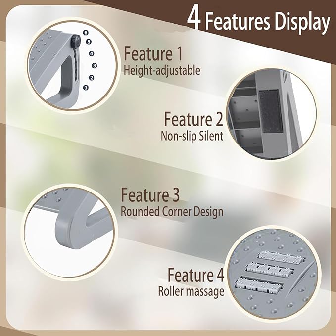 - 【Strong Practicality】: The Footstool Has 6 Different Heights, Which Can Be Adjusted, And is Also Equipped With A Large Area of Small Particle Massage Surface And 5 Large Massage Rollers, When Working, Put Your Feet On it And Roll The Wheels. it Not Only Massages The Soles of The Feet, But Also Promotes Blood Circulation And Completely Relaxes The Legs.