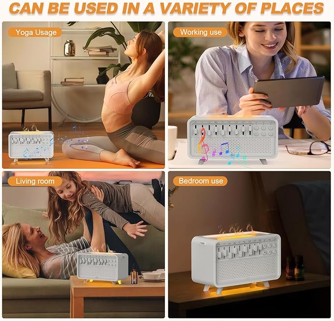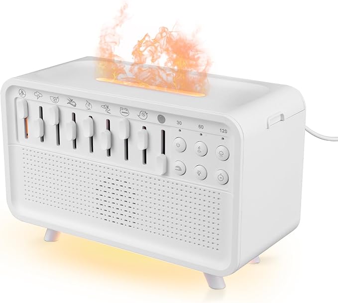 - [3 Levels Warm White Night Light]: Press the Night Light's mist button to activate the flame effect,the mist light and bottom light each have their own dedicated button,offering flexibility for any mood or moment. Soft ambient glow with adjustable 3 brightness levels(low, medium, high),shusher baby sleep.Night light sound machine for babies also to make nighttime parenting easier---no harsh glare, no need to stumble in the dark, and won't interrupt your partner's rest.