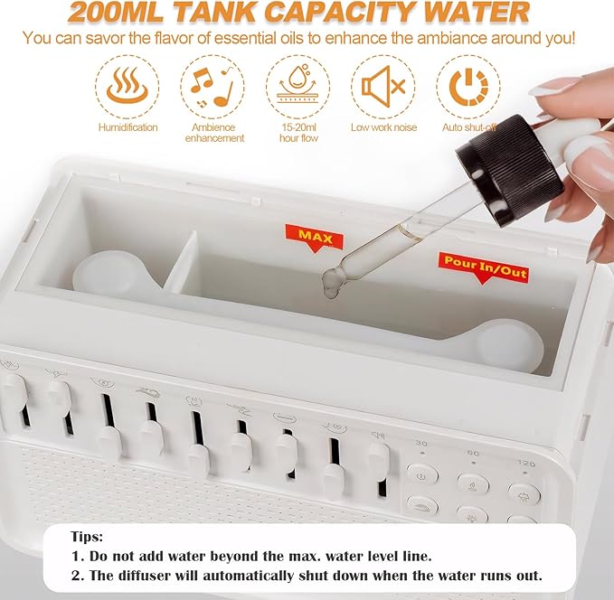 - [Auto Shut-Off & Smart Timer Control]:Features built-in dry-run protection that automatically stops misting when water runs out—preventing damage and ensuring safety. With a 30/60/120-minute timer, the device powers off all functions—including humidifier, white noise, Bluetooth speaker, and night light.Whether you're using it as a portable white noise machine for baby sleep,or an office sound machine—once the countdown ends, giving you peace of mind whether you're sleeping, working, or caring for baby.