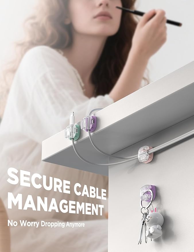- Clean adhesion. Zero residue. Reuse with ease: This cable clips featuring a high-strength nanogel adhesive that holds firmly on desks, wood, glass, marble, tiles, walls, nightstands, and car dashboards—then removes cleanly without damage. Includes 3 extra adhesive pads so you can reposition again and again. 𝐍𝐎𝐓𝐄: 𝐂𝐥𝐞𝐚𝐧, 𝐝𝐫𝐲 𝐬𝐮𝐫𝐟𝐚𝐜𝐞. 𝐏𝐫𝐞𝐬𝐬 𝟑𝟎 𝐬𝐞𝐜. 𝐖𝐚𝐢𝐭 𝟐𝟒 𝐡𝐫𝐬 𝐟𝐨𝐫 𝐟𝐮𝐥𝐥 𝐬𝐭𝐫𝐞𝐧𝐠𝐭𝐡.
