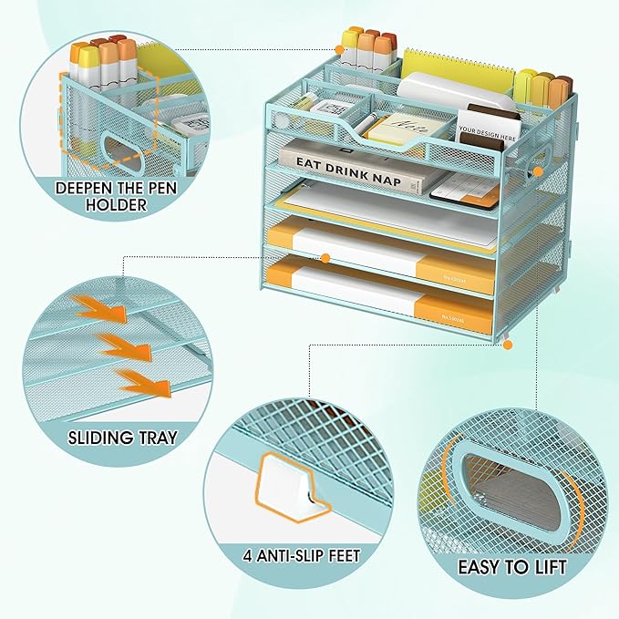 5 Tier Paper Letter Tray with 3 Drop-in Pen Holders, Mesh Desk File Organizer with Handle, Desk Organizers and Accessories for School,Home, Office Supplies Storage-Blue