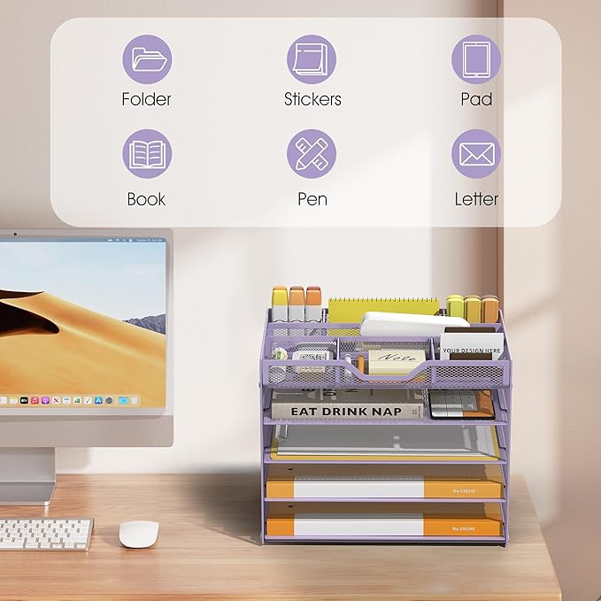 5 Tier Paper Letter Tray with 3 Drop-in Pen Holders, Mesh Desk File Organizer with Handle, Desk Organizers and Accessories for School,Home, Office Supplies Storage-Purple
