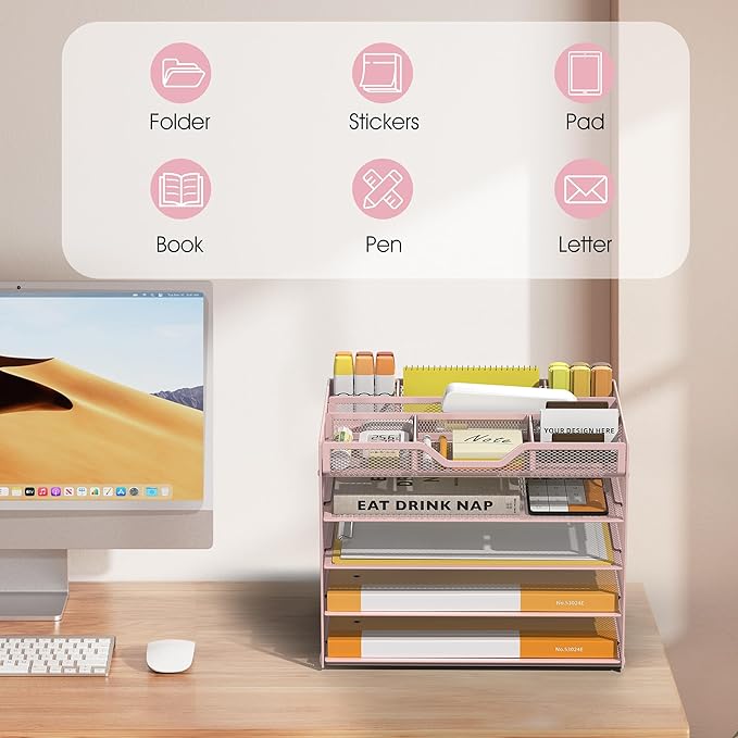 5 Tier Paper Letter Tray with 3 Drop-in Pen Holders, Mesh Desk File Organizer with Handle, Desk Organizers and Accessories for School,Home, Office Supplies Storage-Pink