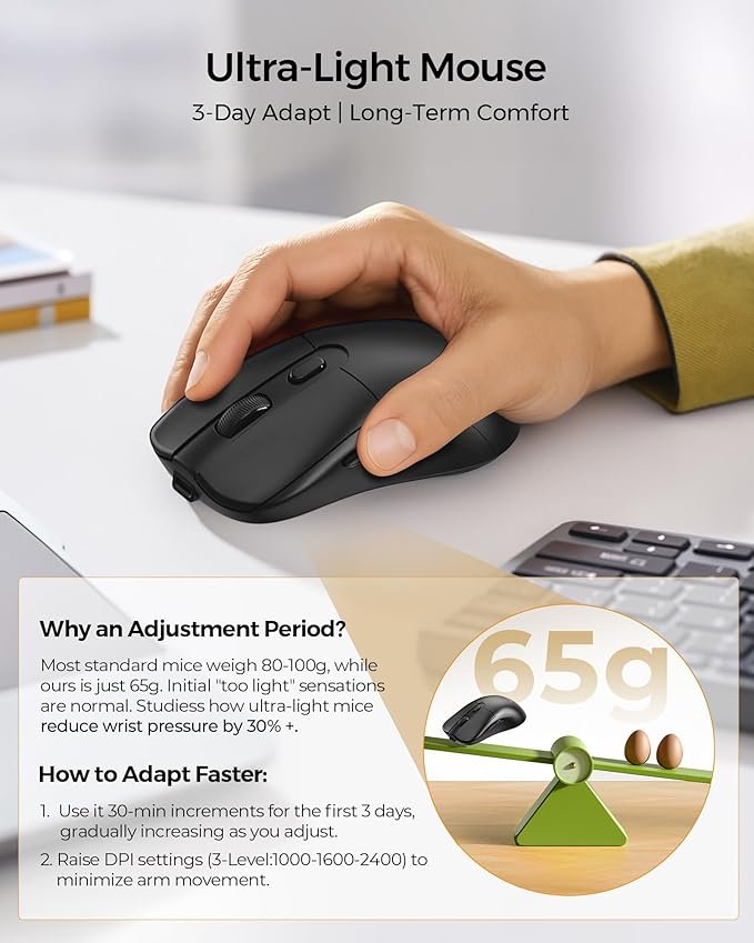 - Ergonomic Relief: Ergonomic keyboard and mouse designed for all-day comfort. The wave-shaped keys and cushioned wrist rest reduce wrist strain, while the lightweight mouse (65g) glides effortlessly. Ideal for extended office use
