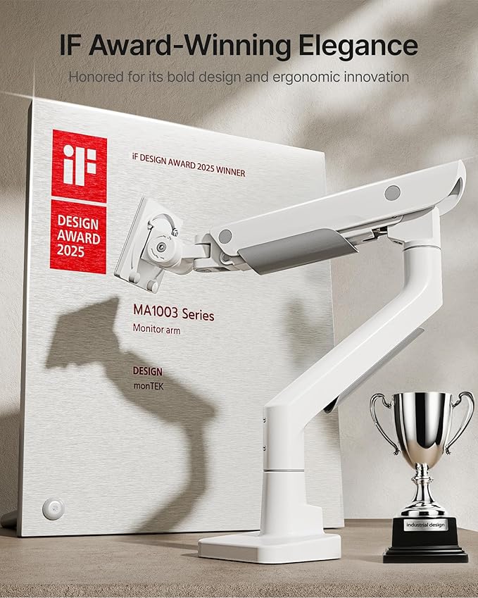 - 【Award-Winning Design & Premium Aluminum Build】Crafted from high-grade aluminum and honored with an iF Design Award, this monitor arm blends exceptional durability with refined aesthetics. The hidden gas spring tension port ensures a sleek look while enabling long-term strength and performance.