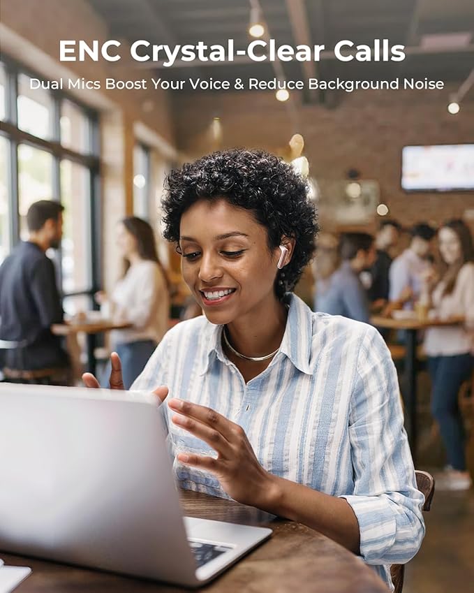 - Superior Sound & Clear Calls: These true wireless earbuds feature 13 mm precision drivers and a custom acoustic chamber that deliver deep, punchy bass, naturally balanced mids, and sparkling highs for studio-quality audio. Easily switch between five professional EQ presets to perfectly match any music genre, while dual ENC microphones with advanced noise reduction eliminate up to 98% of background noise—keeping your calls crystal-clear whether you're commuting, at work, or pushing through an intense workout.