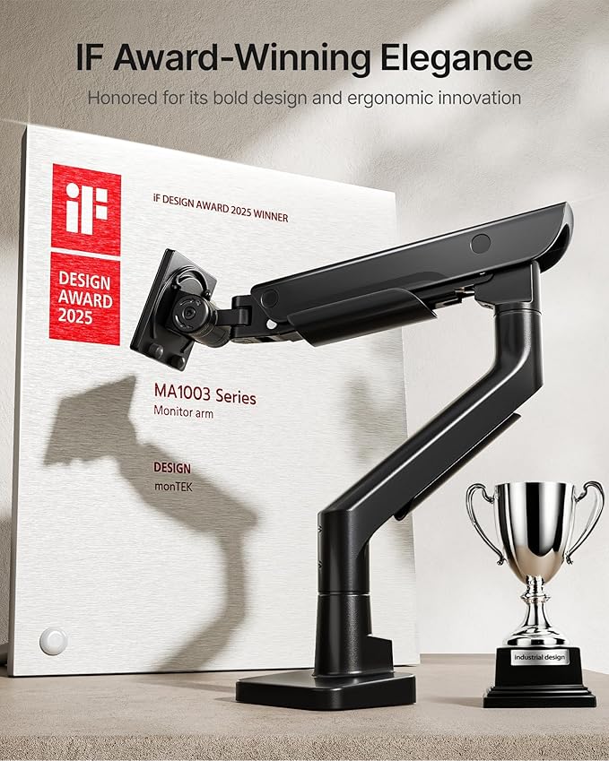 - 【Award-Winning Design & Premium Aluminum Build】Crafted from high-grade aluminum and honored with an iF Design Award, this monitor arm blends exceptional durability with refined aesthetics. The hidden gas spring tension port ensures a sleek look while enabling long-term strength and performance.