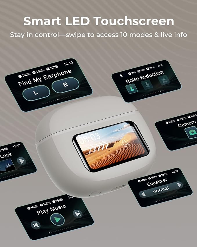 - Smart Touchscreen Case for Effortless Control: Our wireless earbuds come with a smart charging case that does more than just charge. Unlike traditional cases, it features a responsive touchscreen—skip tracks, adjust volume, manage calls, take remote photos, or locate your earbuds with just a tap or swipe. Packed with 10 powerful functions in one compact case, it’s the ultimate control hub. No phone needed, making everything more convenient and smarter.