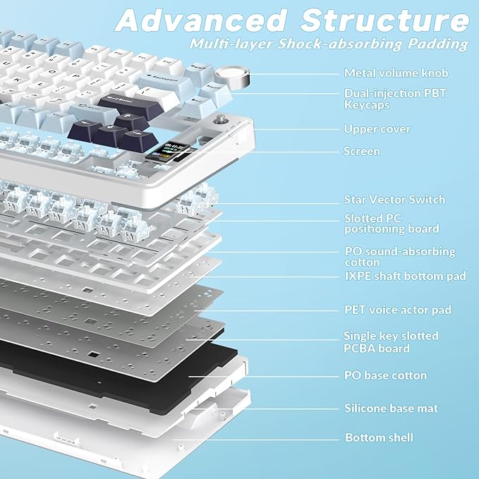 - Creamy Keyboard with Advanced Structure: The S75 Pro thocky keyboard features an advanced structure, extended integrated silicone pad, and PCB single key slotting, better optimizes resilience and stability, making the hand feel softer and more elastic. Five layers of filling silencer fills the gap between the PCB, the positioning plate and the shaft, effectively counteracting the cavity noise sound of the shaft hitting the positioning plate, and providing a solid feel