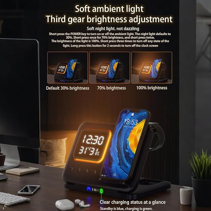 - 【5-in-1 Smart Hub】 Combines fast wireless charging + digital clock + weather station + night light