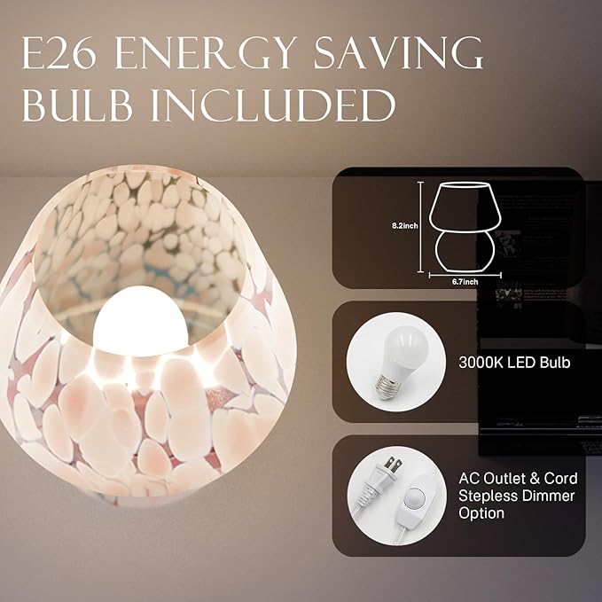 - 【Small Lamp with Wide Application】Not just a decorative mushroom night light, this versatile lamp also serves as a stylish modern glass lamp for sideboards, bedrooms, living rooms, nurseries, dining rooms, coffee shops, bars, and more. It's an excellent gift for holidays, birthdays, Valentine's Day, Christmas, and Thanksgiving.