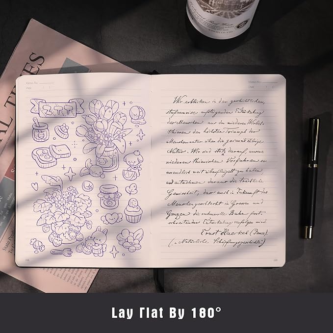 - 【More Details of Notebook】Our A5 leather notebook measures 6.2 x 8.3 x 1 in (15.8 x 21 x 2.5 cm) There are two bookmarks to help you quickly find the last page you recorded, an elastic band to keep the notebook closed, and an inner pocket to store your stuff, 180°flat laying design for your writing convenience.