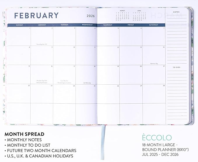 Eccolo 2025-2026 Large Agenda Planner, 18 Month, Yearly, Monthly & Weekly Views, Reminders, Goals Tracker (Flexi-Cover - 8 x 10")