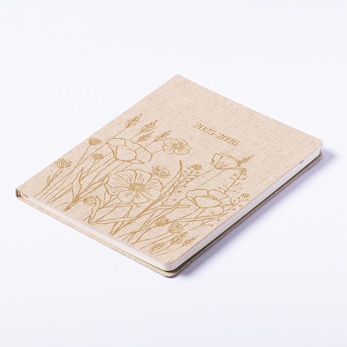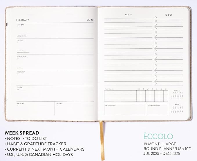 Eccolo 2025-2026 Large Agenda Planner, 18 Month, Yearly, Monthly & Weekly Pages, Habit & Gratitude Tracker (Linen Flexi-Cover- 8 x 10")
