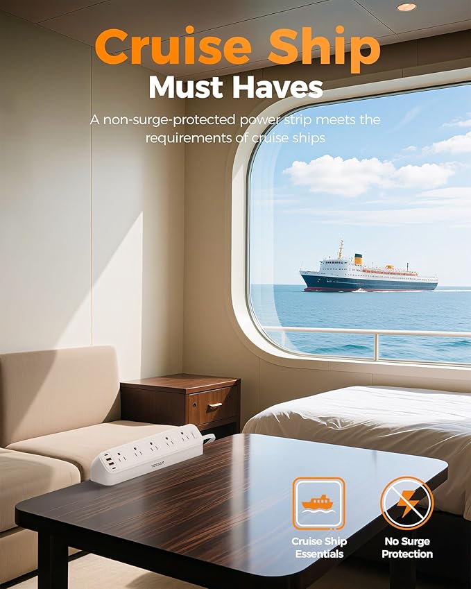 - Cruise Acceptable Power Strip: Without surge protection, this flat outlet extender is absolutely cruise accessories must haves; The flat plug extension cord fits easily in luggage or backpacks—practical for travel essentials without bulk