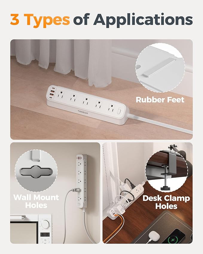 - Mountable Power Strip: It can also be hung on the wall by choosing not to install desk clamp components; 2 mounting holes allow it securely installed in various applications; 2 rubber strips at the bottom efficiently keeps it from slipping and sliding