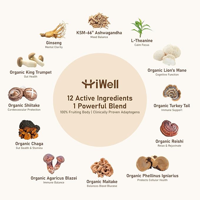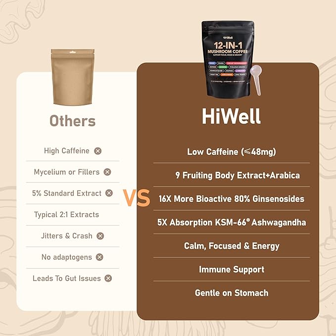 - 🌿 12-in-1 Formula Backed by Nature: Unlike ordinary mushroom coffees, HiWell delivers a powerful blend of 9 fruiting body mushrooms + functional adaptogens like Ginseng, KSM-66 Ashwagandha, and L-Theanine. Each scoop supports energy, clarity, and calm