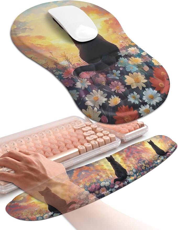 Hokafenle 2in1 Combination, Wave Keyboard Wrist Rest and Ergonomic Curvature Mouse Pad Wrist Support for Relieve Wrist Pain, Filled with Soft Cushion Memory Foam, Wishing Cat