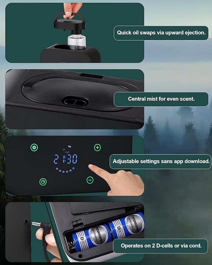 Waterless Essential Oil Diffuser, Portable Bluetooth Aromatherapy Device for Home, 24/7 Customizable Schedule, 1600 sq ft Coverage, 2×D Cell or Plug-in Powered (Dual Power-Black)