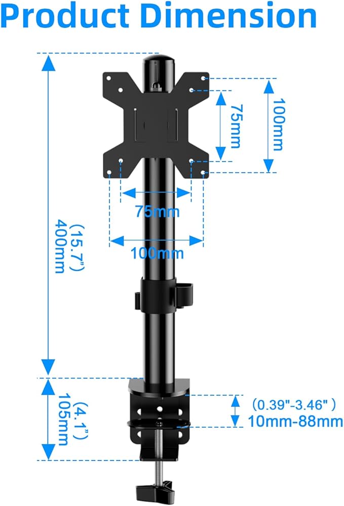 - 【Wide Compatibility】Our single monitor stand supports most 13-27" monitors with VESA mounting patterns 75x75mm or 100x100mm.The maximum weight capacity of this product is approximately 17.6lbs(8KG). Please check the VESA pattern and weight of the monitor before purchase.