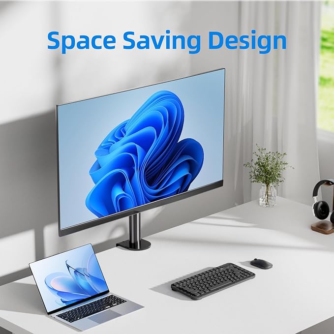 - 【Saving Desktop Space】Maximize your workspace efficiency. The monitor arm installs securely with a sturdy C-clamp (grommet mount option usually available), taking minimal desk space. Integrated cable management clips keep wires neatly organized and your desktop clutter-free.