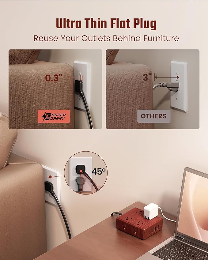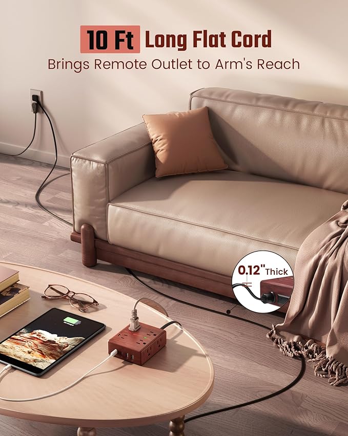 - Flat Brown Extension Cord 10 ft: With an ultra thin flat head (only 0.3 inches), our flat brown power strip can easily fit in tight spots and hide behind furniture (sofa /bed /nightstand) with wall-flush alignment; The 45° right angle plug creates extra space for other receptacles below without blocking.