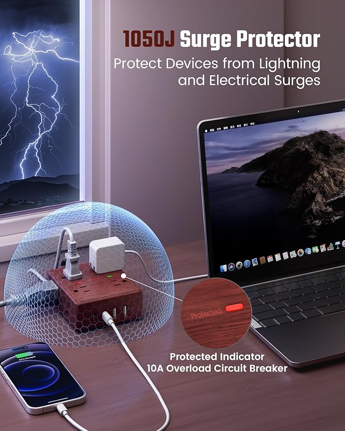 - 8-Point Safety Protection System: Combines 1050 Joules surge protection, 1382℉ fire retarding, 1250W overload protection, 10A over-current protection, and more to protect your appliance and electronics, providing you a safe and reliable indoor charging environment.
