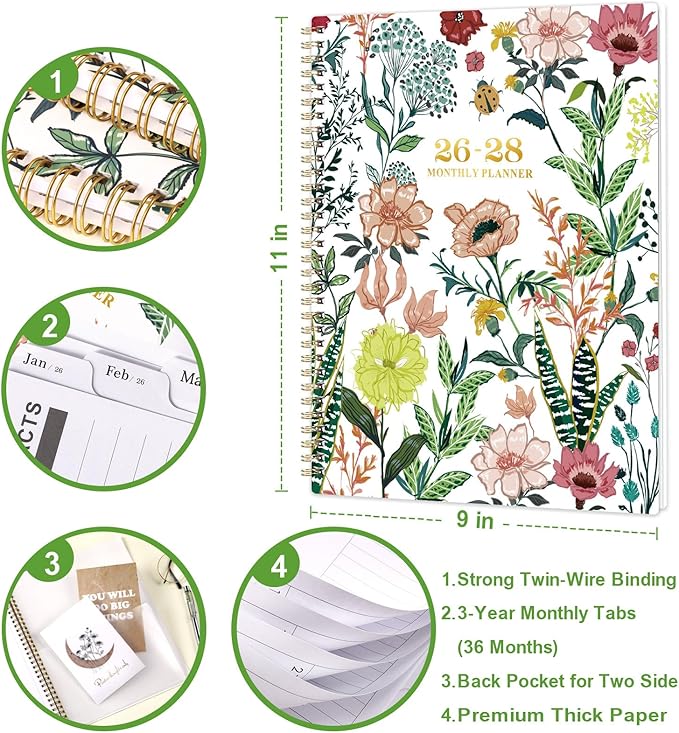 - 🌼 MONTHLY PLANNER 2026-2028 – 3 year planner 2026-2028 features 36 months of monthly pages from January 2026 to December 2028, for an easier planning, organizing or tracking. The size is 9" x 11", large enough to write in every deadline, special events, meetings, appointments, etc.
