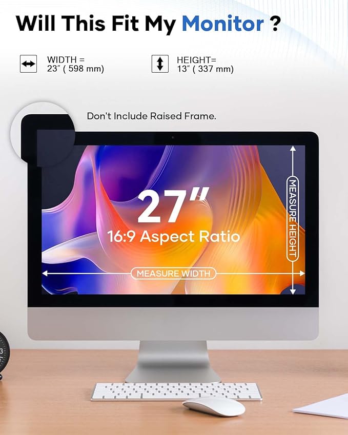 - 【27 Privacy filter dimensions】Width:23"(23.54inches/598mm),Height:13"(13.27inches/337mm)-16:9Aspect Ratio. This computer privacy screen can be seamlessly adapted. Support the vast majority of mainstream models on the market. In order to ensure the best user experience, it is recommended to carefully measure the width and height of the screen before placing an order. If you are not sure about the size, please feel free to contact us. The professional team will answer your questions!
