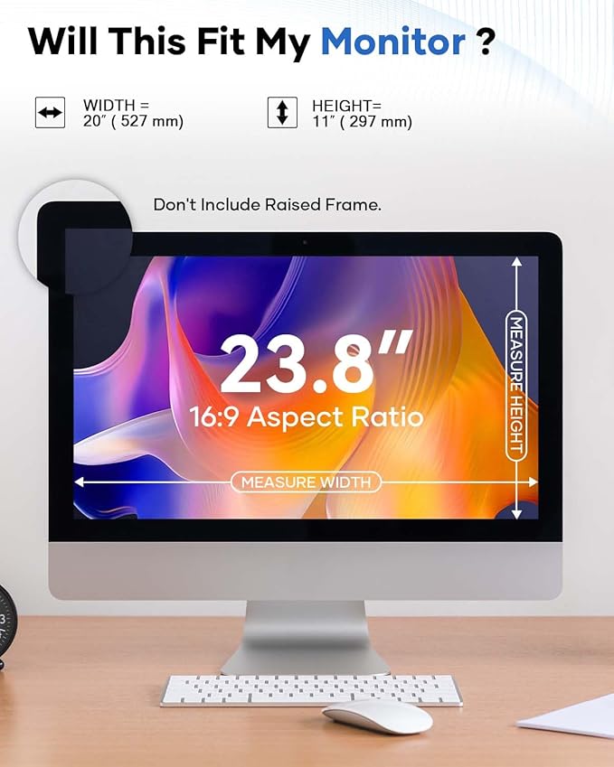 - 【23.8 Privacy filter dimensions】Width:20"(20.74inches/527mm),Height:11"(11.69inches/297mm)-16:9Aspect Ratio. This computer privacy screen can be seamlessly adapted. Support the vast majority of mainstream models on the market. In order to ensure the best user experience, it is recommended to carefully measure the width and height of the screen before placing an order. If you are not sure about the size, please feel free to contact us. The professional team will answer your questions!