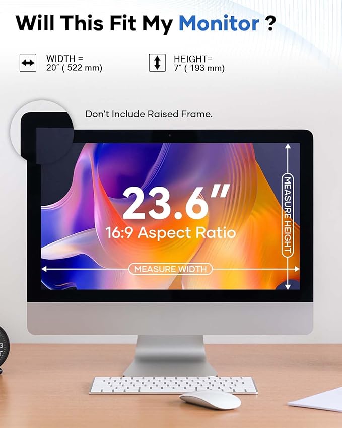 - 【23.6 Privacy filter dimensions】Width:20"(20.55inches/522mm)Height:7"(7.6inches/193mm)-16:9Aspect Ratio.This computer privacy screen can be seamlessly adapted. Support the vast majority of mainstream models on the market. In order to ensure the best user experience, it is recommended to carefully measure the width and height of the screen before placing an order. If you are not sure about the size, please feel free to contact us. The professional team will answer your questions!
