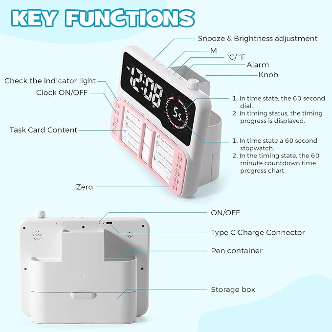 - 7-in-1 Visual Time Management Tool: Designed for kids and adults with ADHD, this multifunctional timer includes a visual clock, daily planner, countdown timer, alarm, calendar, temperature display, and storage tray—all in one sleek unit.