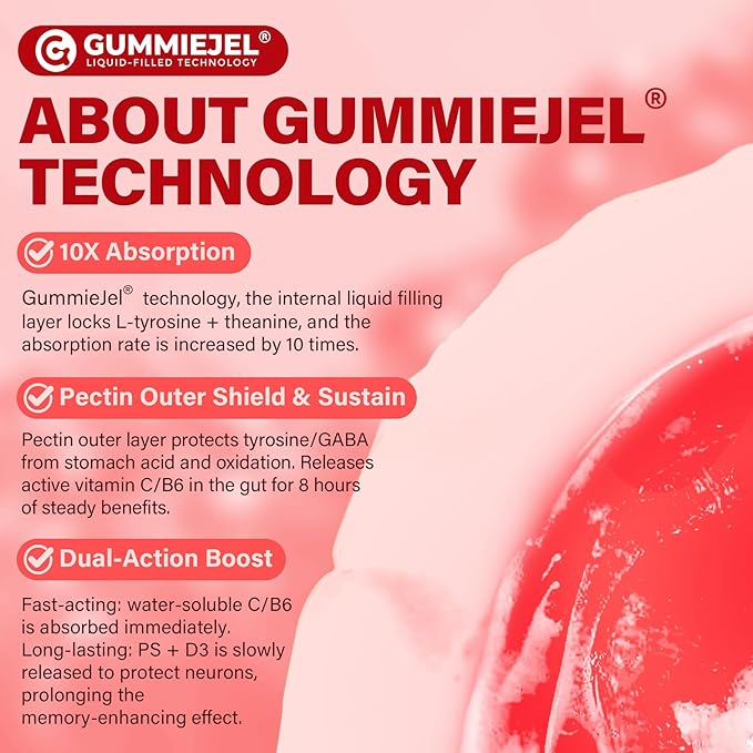 - Active Ingredients, Maximum Absorption: GummieJel Liquid Core Delivery System efficiently delivers L-Tyrosine and Theanine. Unlike standard gummies, each gummy contains active vitamins C & B6 within a protected liquid core, promoting absorption and maintaining effectiveness. The pectin shell locks in potency; the core ensures rapid absorption. -- Sugar-free l tyrosine gummies for women and men. Just two delicious focus gummies a day can help you stay calm!