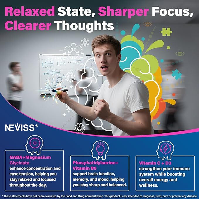 - Ease Thought Tension and Mood Balance: GABA + Magnesium Glycinate calm overactive nerves, quickly relieving jitters and racing thoughts. Phosphatidylserine (sunflower derived) + Vitamin B6 stabilize mood and prevent Mental Fatigue induced burnout. Feel grounded, not overwhelmed—perfect for social tensions or everyday trouble.