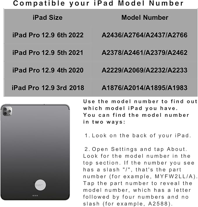 - Only Fit for iPad Pro 12.9 2022 6th/2021 5th/2020 4th/2018 3rd generation full display all screen Without Home Button model number A2899/A2898/A2900/A2436/A2764/A2437/A2766/A2378/A2461/A2379/A2462/A2229/A2069/A2232/A2233/A2014/A1895/A1876/A1983 (Please turn over your iPad to check the model number before purchase)