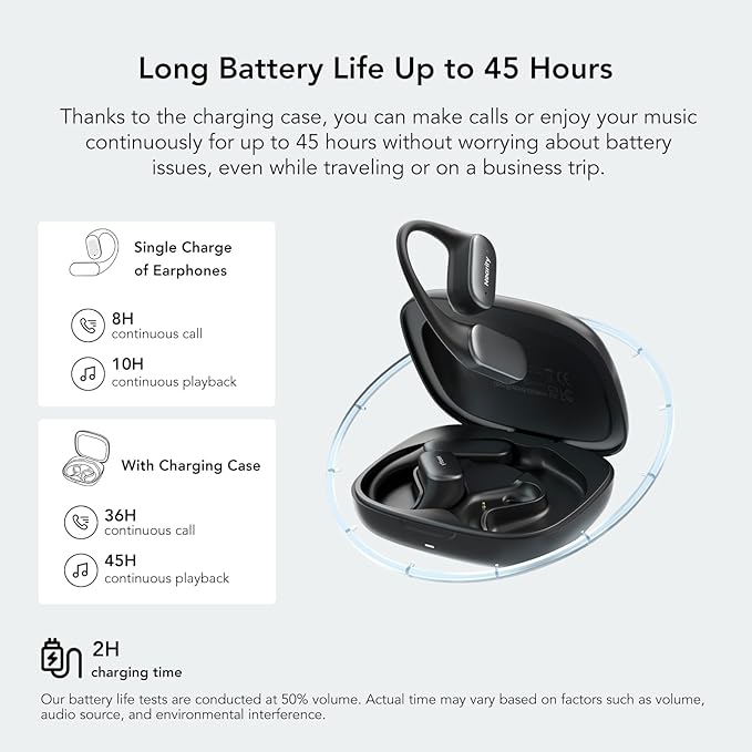 - Extended Battery Life with Charging Case: The wireless earbud delivers up to 10 hours of playback on a single charge at 50% volume, while the charging case provides an additional 35 hours of use, allowing for 3 to 4 recharges. This ensures extra power on the go, offering peace of mind and uninterrupted access to calls, music, and other audio content throughout the day. With up to 45 hours of combined use and a quick 2-hour full charge, these earbuds are perfect for long days and busy lifestyles.