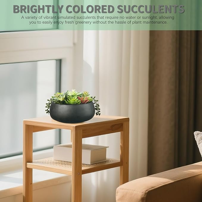 Artificial Succulent Plants Fake Potted Indoor with Ceramic Pot - Home Office, Bedroom, Bathroom Decor - Low Maintenance Desk Plants for Coffee Table & Room Aesthetics(Black)