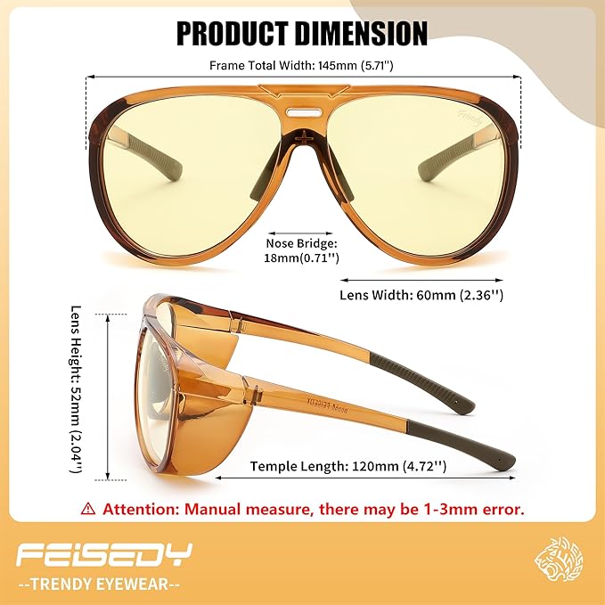 - Product Dimensions - 60mm (2.36 inch) of lens width, 52mm (2.04 inch) of lens height, 120mm (4.72inch) of temple length, 18mm (0.71inch) of nose bridge, and 145mm (5.71 inch) of overall frame width