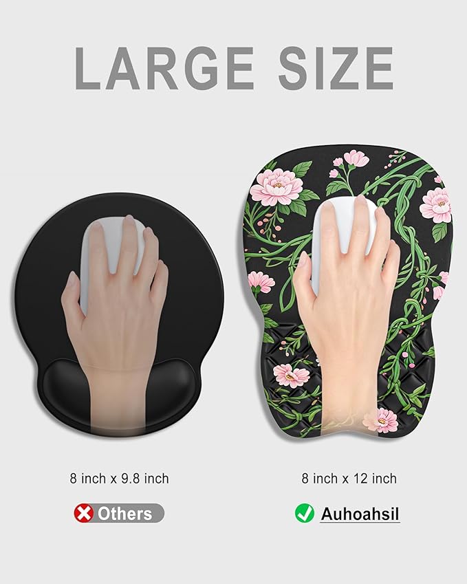 Auhoahsil Ergonomic Mouse Pad with Wrist Rest, Comfortable Slope Computer Mouse Mat with Wrist Support, Memory Foam Filling, Non-Slip Silicone Base, Pain Relief for Gaming Work, 8" x 12", Black Vines